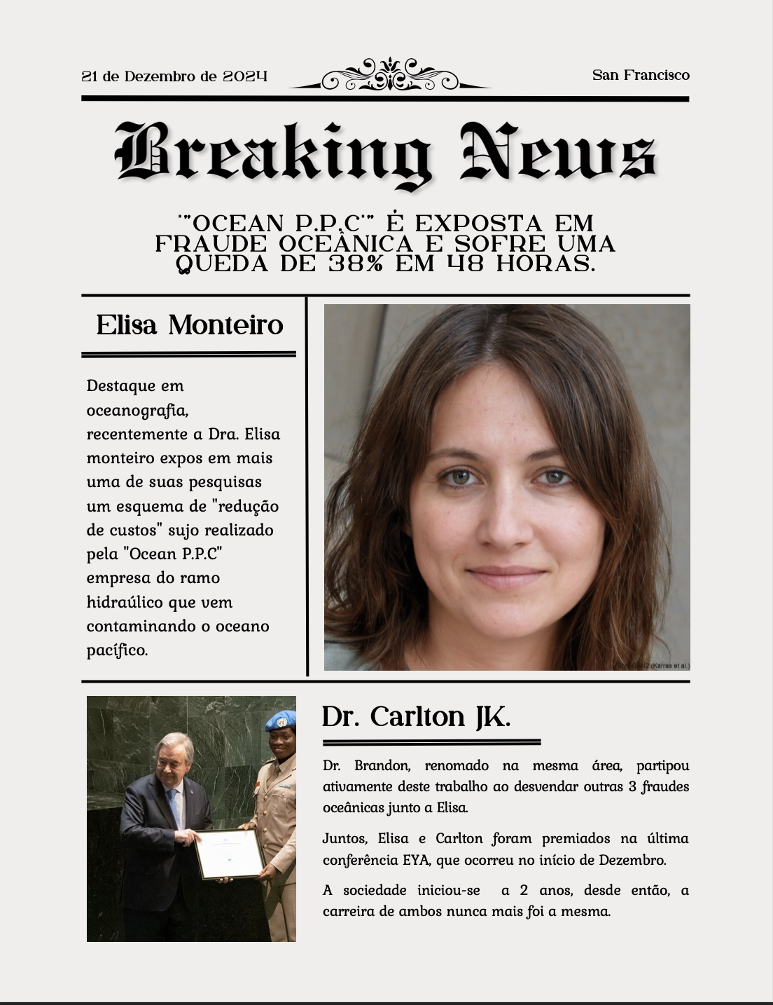 Em março de 2025 a Dr. Elisa monteiro (Oceonógrafa renomada mundialmente) embarcava em um luxuoso cruzeiro de luxo que cruzava San Francisco em direção a Tóquio, dias depois, misteriosamente, Elisa é encontrada morta em um dos botes do andar subterrâneo do navio de uma forma brutal. As pistas são mínimas e o chocante assassinato apavora os hóspedes do gigante navio e choca o mundo afora devido a sua execução.