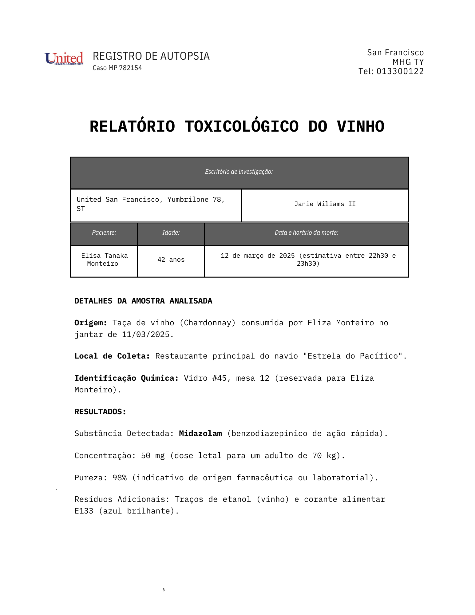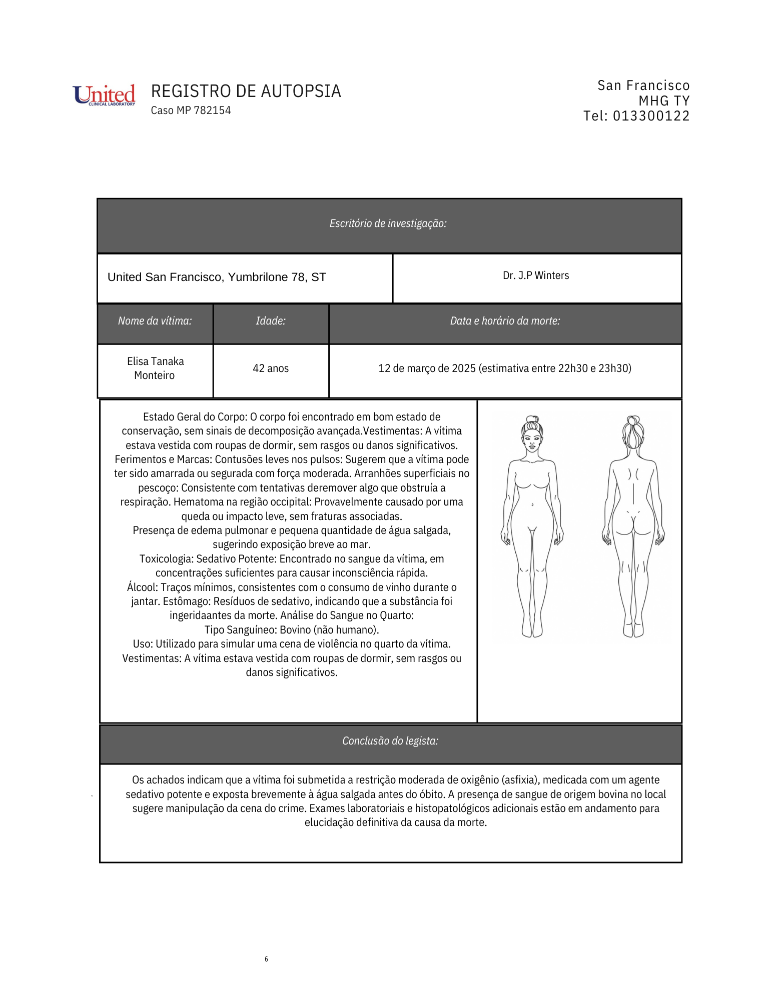 • Analise todas as evidências (23 páginas de investigação) com laudos policiais, autopsia, entrevistas etc.